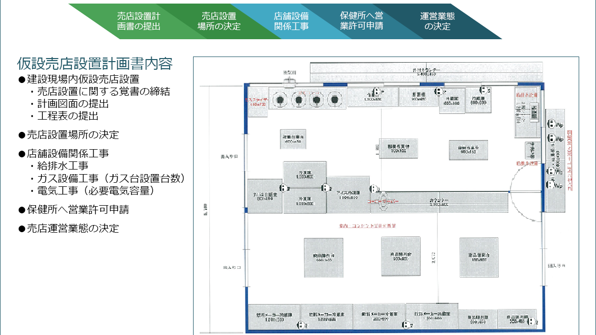 店舗の形態はそれぞれの現場に合わせて設計いたします。 現場作業に支障をきたないことは当然のこと、効率的な運営と作業従事者の皆様が快適にお買いものができるレイアウトを心がけております。